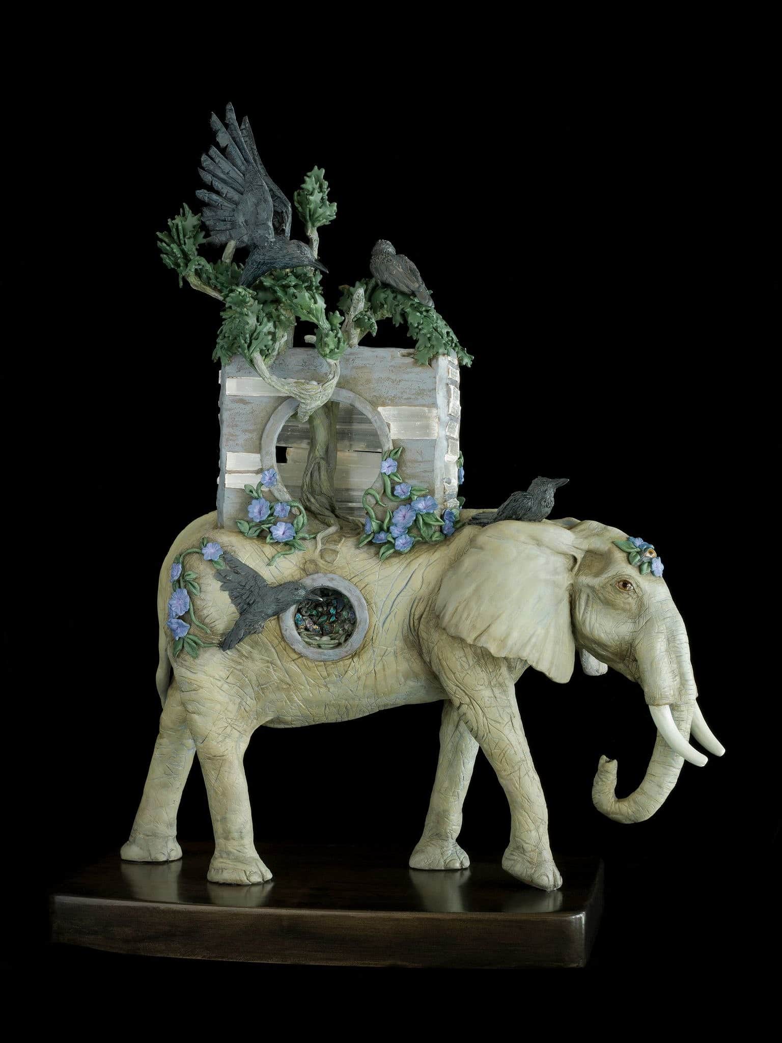 Seeking Sanctuary front view – Epoxy clay, Selenite, Peacock Ore, wood
